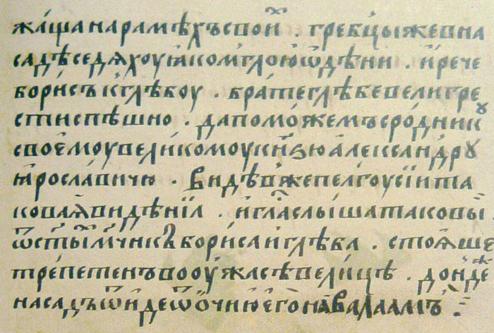 [держа руки] на плечах своих, гребцы же в насаде сидели словно мглою одетые. И сказал Борис Глебу: „Брат Глеб, вели грести быстрее, чтобы помочь сроднику своему, великому князю Александру Ярославичу". Пелгусий, увидев такое видение и услышав такие слова святых мучеников Бориса и Глеба, стоял трепетен, в ужасе великом, пока насад не скрылся с глаз его [до Валаама] |