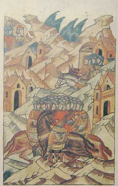 В центре миниатюры - плотная группа съехавшихся с противоположных концов всадников,их лица вплотную приближены друг к другу. Художник старается передать атмосферу тайного сговора.