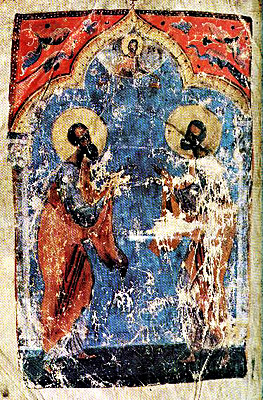 На иллюстрации — Апостол толковый 1220 г. Миниатюра с изображением апостолов Петра и Павла.