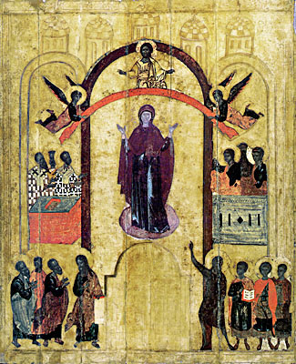Название иконы совпадает с названием одного из самых любимых русских церковных праздников, появившихся еще в Древней Руси. Этот праздник получил распространение в XI в. и именно на Руси, хотя в основе его лежит событие, происшедшее в Константинополе (столице Византии) еще задолго до Крещения Руси. Однажды во время страшной осады вражеским войском Константинополя Богородица явилась молящимся во Влахернском храме и распростерла Свой омофор над ними. На следующий день город был спасен от нападавших. На Руси этот праздник выражал и выражает веру православных людей в то, что Пресвятая Богородица приняла Святую Русь под Свое покровительство и защищает молящихся Ей.