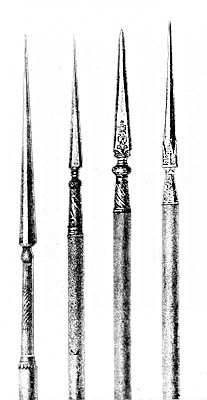Вид холодного оружия славян, которое применялось с VI–VII вв. В XII–XIII вв. копье было главным и самым эффективным оружием ближнего боя. Узкое копье называлось пикой, а крупное (весом 700–1000 г) — рогатиной. Существовали еще дротики или суслицы, занимавшие промежуточное положение между стрелой и копьем. Наконечники копий — одна из самых частых археологических находок. Обычный вес наконечника 200–400 г. Наконечник прикреплялся к древку размером 180–200 см. Копья, имевшие древко более 3-х метров, предназначались для конных воинов.