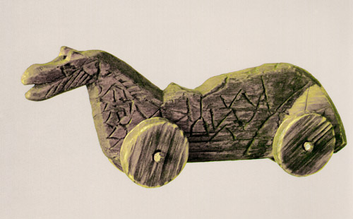 Резным контуром изображена сбруя. Изготовлен из дерева. Длина — 21 см. Найден в Древнем Новгороде.