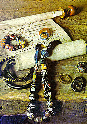 Одно из распространенных женских украшений на Руси. Только в Новгороде при раскопках найдено более 2 тыс. бус различной формы и размеров, изготовленных из цветного стекла, горного хрусталя, сердоликов и рубинов, а также из литого золота. Новгородские мастера использовали в качестве поделочного материала и янтарь. В XII–XIV вв. хрустальные и сердоликовые бусы выполняли роль мелких разменных денег.