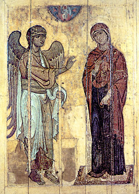 «Устюжское Благовещение» второй половины XII в. — одна из самых знаменитых древнерусских икон Богоматери. Происходит не из Великого Устюга, как гласило устное предание, а из Георгиевского собора Юрьева монастыря под Новгородом, откуда была привезена в Москву по приказанию Ивана Грозного.