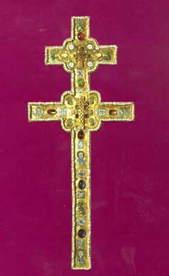 На иллюстрации — крест напрестольный. Изготовлен русским эмальером Лазарем Богша в 1167 г. Эмаль, жемчуг, драгоценные камни.