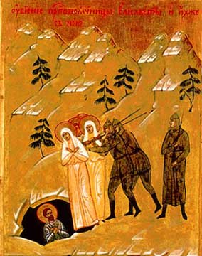 На клейме иконы изображен момент, когда Великую княгиню Елисавету и ее келейницу Варвару вместе с Великим князем Сергеем Михайловичем, князем Владимиром Палеем, еще тремя князьями и преданными слугами сбрасывают в шахту. Великая княгиня Елисавета Феодоровна, по происхождению принцесса Гессен-Дармштадтская, родная сестра императрицы Александры Феодоровны, вышла замуж за Великого князя Сергея Александровича, пятого сына императора Александра Второго. Родившись в протестантизме, она познакомилась с православным вероучением после переезда в Россию. Елисавета Феодоровна от рождения обладала глубокой религиозностью и в Православии она нашла то, что отвечало самым главным запросам ее души. Великий князь Сергей Александрович боролся с революционерами и в 1905 году погиб от бомбы, брошенной одним из них. После кончины супруга Великая княгиня полностью предается духовной жизни и делам милосердия. Ею была создана знаменитая Марфо-Мариинская обитель в Москве. Духовный путь великой княгини завершился мученическим венцом. На иконе святые жены изображены в светлых, почти белых одеждах, которые в соединении с духом полного смирения и покорности Воле Божией, выраженном в недвижной сдержанности их падающих фигур, являют в них Невест Христовых. Здесь цвет символизирует невинность жертв с одной стороны и свирепость убийц — с другой.